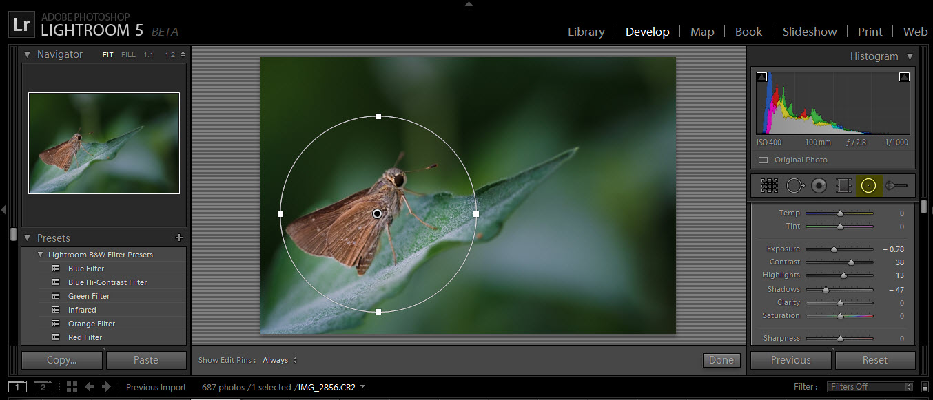 Radial gradient filter: Situated between the adjustment brush and the density gradient filter is the radial gradient filter. With this tool you can create an off-center vignette. The radial filter allows you to make localized changes in an image which can be used to grab viewers’ attention.