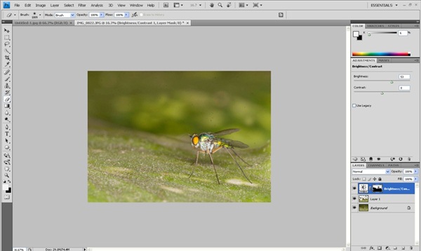 Brightness/Contrast tool can be found under Image ->Adjustments -> Brightness/Contrast. A certain level of brightness should be set according to the brightness level of the foreground. Then, follow step 2.1 to remove the overexposed pixels on the subject and foreground of this frame.