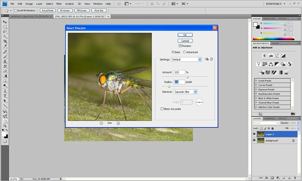 Capturing the details on the subject may vary based on the lens structure and camera sensors. If the subject looks blunt in appearance, we can enhance the details of the subject by applying the sharpness in selected area. Here, I am using ‘Smart Sharpen’. For applying the sharpness, we have to create a new layer (CTRL+J in PC) as it ensures non-destructive editing. Then, select Filter->Sharpen->Smart Sharpen.