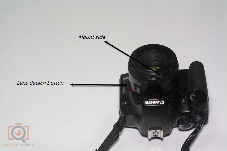 - Now press the Depth of field preview button (shown in the picture). This closes down the aperture to the f-number you have set. So, while depressing the DOF preview button, detach the lens from the camera.